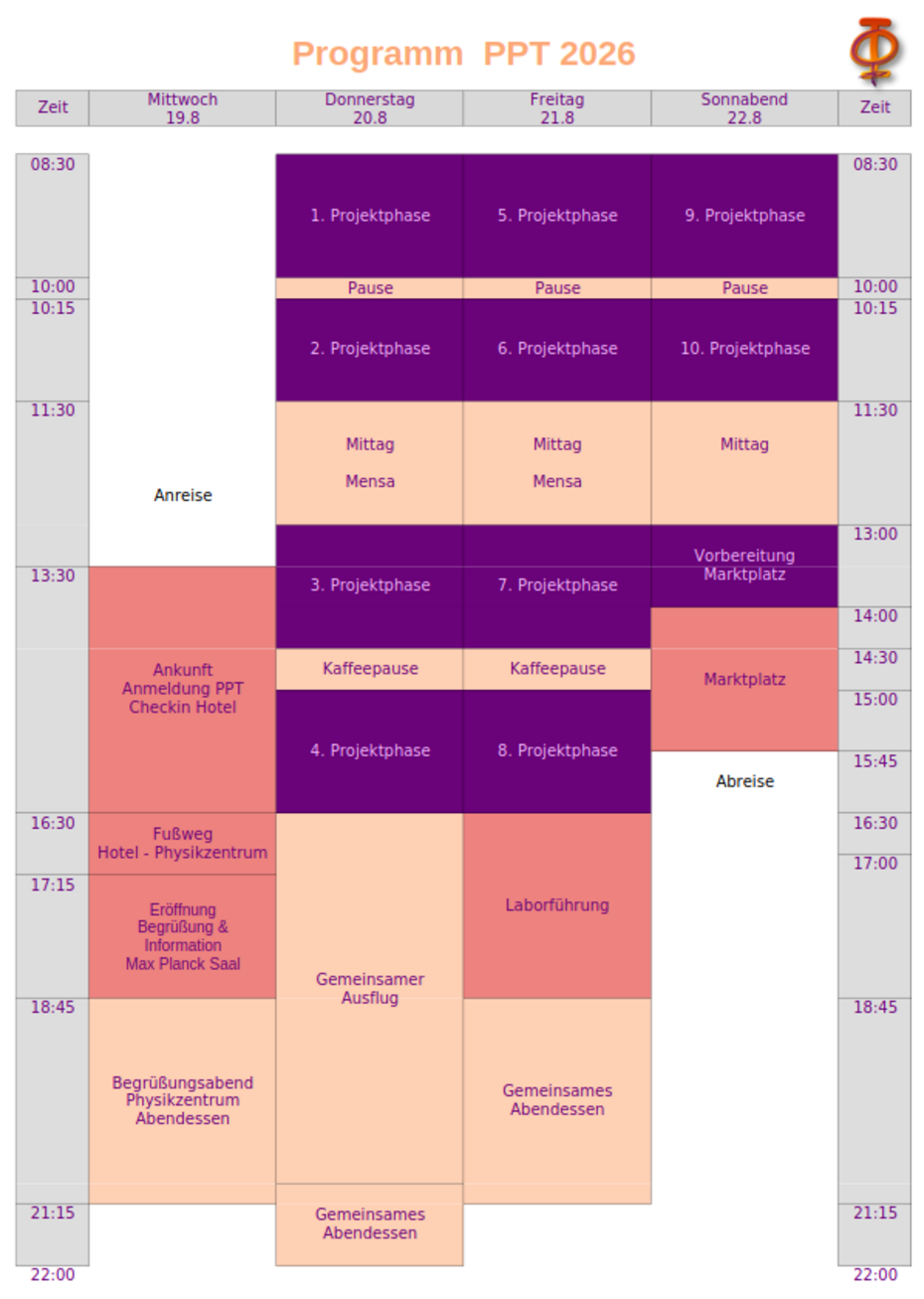 Mit dem Programm möchten wir dir gerne ganz viel Zeit für die Arbeit in einem Forschungsprojekt deiner Wahl ermöglichen. Dies sind die ganzen Einträge mit lila Hintergrund. Aber zu einem Workshop gehört auch, dass es viele Phasen geben soll, in denen wir alle zusammen etwas erleben. Diese Phasen sind in rötlichen Farbtönen im Plan vermerkt. Du siehst, dass uns dies wirklich genauso wichtig ist, wie die Forschung, denn Forschung ist immer Teamwork und wir möchten, dass ihr ein großes PPT-Team werdet.